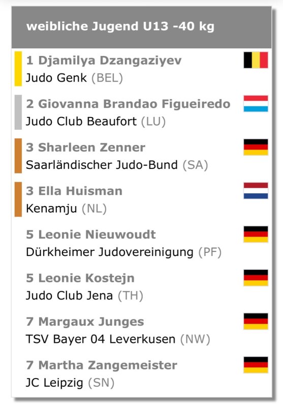 Auch Leonie Kostejn zeigte in der Gewichtsklasse bis 40 kg mit 15 Starterinnen eine starke Leistung. Nach einem Auftaktsieg gegen eine Schweizerin musste sie sich der späteren Finalistin Giovanna Brandao Figueiredo (Judo Club Beaufort, Luxemburg) geschlagen geben. In der Trostrunde folgten zwei weitere Arbeitssiege, bevor Leonie im Kampf um Platz drei knapp unterlag. Mit einem fünften Platz bewies sie eindrucksvoll ihr Potenzial und ihre Kämpfermentalität.