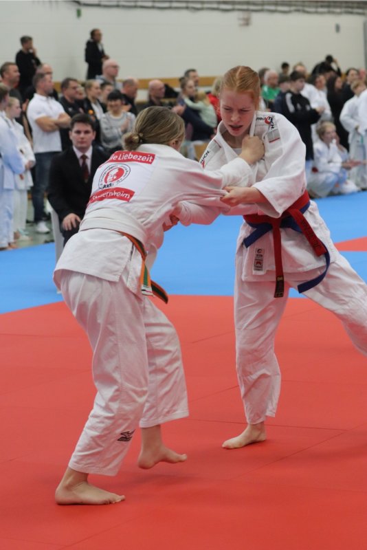 Somit standen wir im Halbfinale gegen die haushohen Favoriten, den Judoclub Leipzig. Der Mannschaftskampf begann mit einem traumhaften Uchi-Mata von Emma Schuster/+57 kg, und wir gingen mit 1:0 in Führung. Danach gingen alle Kämpfe verloren. Amina Bairamova/40 kg gewann den letzten Kampf, und somit war die klare Niederlage mit 2:6 besiegelt. Trotzdem Riesenfreude über den 3. Platz in der Endabrechnung. Damit hat sich das Team für den Deutschlandpokal am 29.11.2025 in Rüsselsheim qualifiziert.