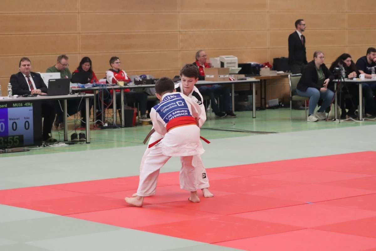 Am späten Nachmittag griffen die U16-Kämpfer ein. Die 43-kg-Klasse war „saustark“ besetzt. Ilja Kacher steigerte sich von Kampf zu Kampf. Erst im Finale musste sich Ilja dem cleveren und abgezockten Gupalo (Wiesbaden) geschlagen geben. Der 2. Platz war eine Superleistung. Auch Thore Schneider - ebenfalls bis 43 kg - kämpfte überlegen und nutzte seine Chancen. Erst im Halbfinale wurde Thore ebenfalls von Gupalo (Wiesbaden) gestoppt. In diesem Kampf fand Thore kein Mittel zum Sieg. Im kleinen Finale zeigte Thore seine Klasse: Schon nach fünf Sekunden gewann er gegen den starken Leipziger Hammermüller mit einer Würgetechnik und belegte somit Platz 3.